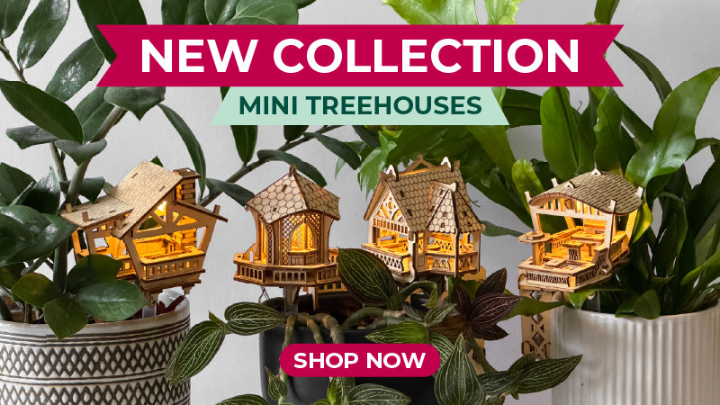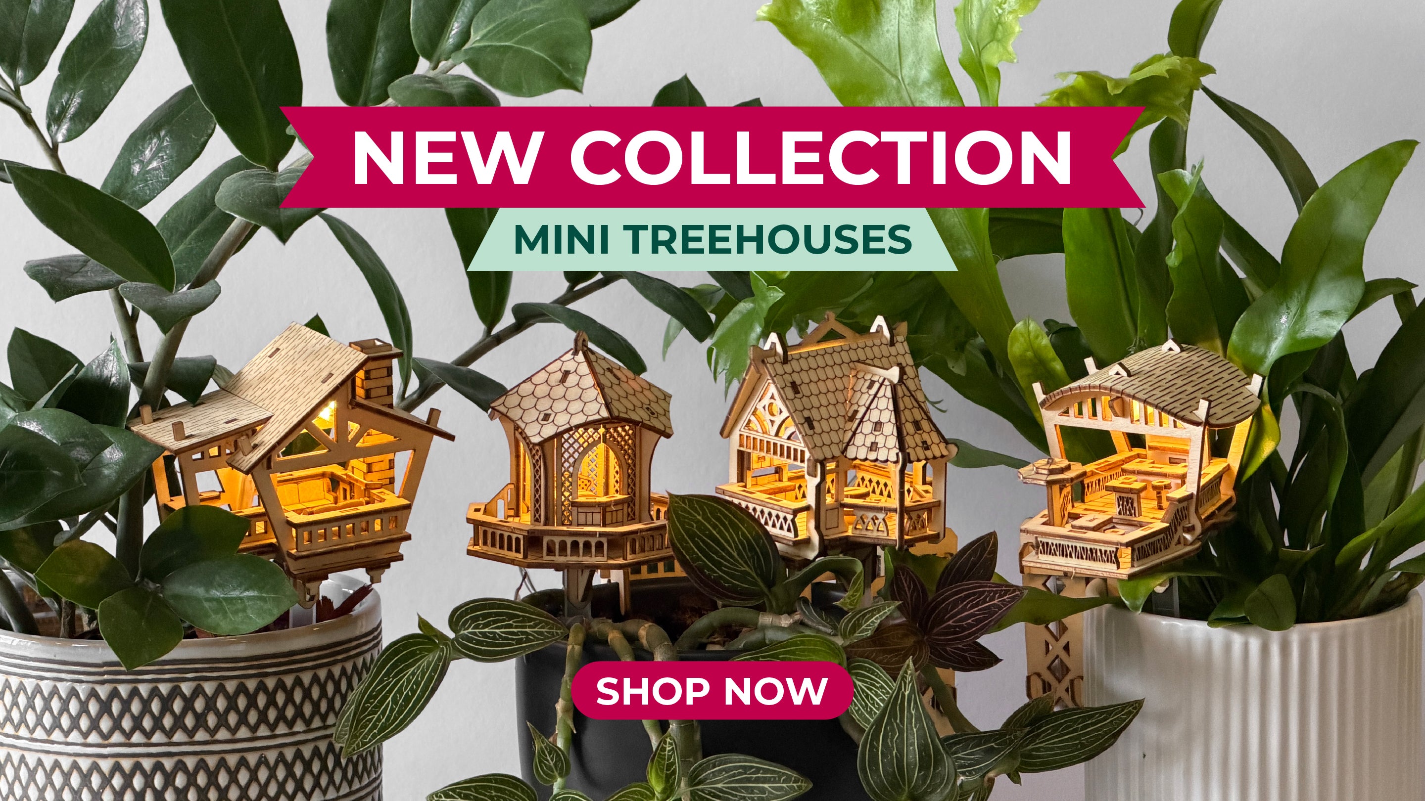 Add a whimsical touch to your plants and bookshelves with the original Tiny Treehouses: unique 3D wooden puzzles for your home.